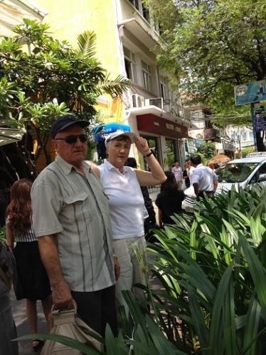 Vọ chồng thầy Kibac trước quán Ngon